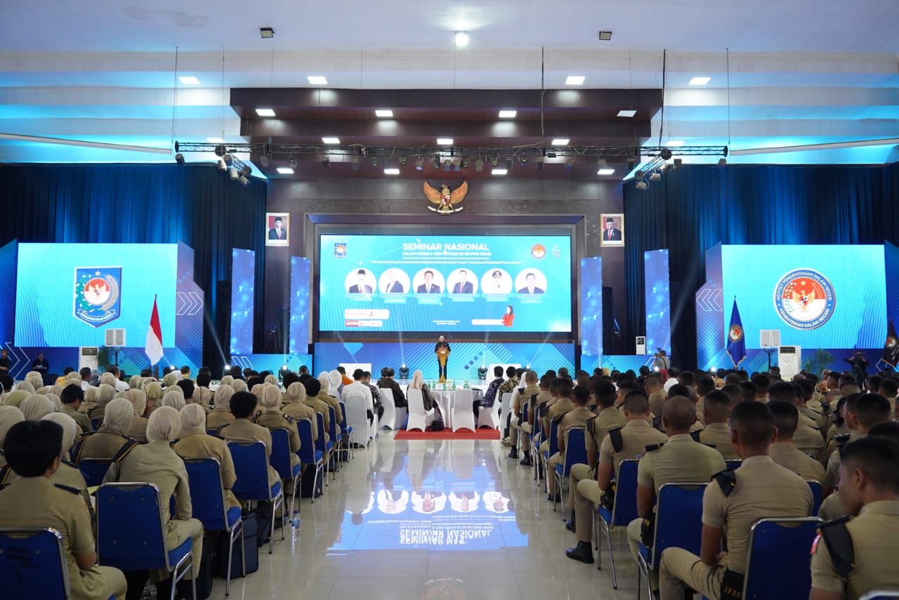 Jatinangor FBI. www.tabloidfbi.com – Kamis (07/03/2024), informasi dan isu-isu hangat terkait pelayanan pemerintahan berbasis elektronik diangkat menjadi tema diskusi pada Seminar Nasional dalam rangka Dies Natalis IPDN Ke-68. Kegiatan ini dilaksanakan di Balairung Rudini Kampus IPDN Jatinangor dengan dihadiri oleh kurang lebih 3.672 peserta, baik yang hadir secara luring maupun daring. Tema “Percepatan Pelayanan Pemerintahan Berbasis Elektronik Dalam Rangka Transformasi Digitalisasi Pemerintahan”, diangkat selaras dengan program pemerintah yang selalu digaungkan oleh Presiden RI. Rektor IPDN, Prof. Dr. Drs. H. Hadi Prabowo, M.M mengatakan bahwa digitalisasi pada saat ini merupakan kebutuhan masyarakat, “Masyarakat perlu pelayanan yang cepat dengan tetap dilandasi norma-norma dan etika yang tinggi. Hal ini juga sejalan dengan program pemerintah yang kini terus menggelorakan sistem pelayanan berbasis elektronik”, tuturnya.