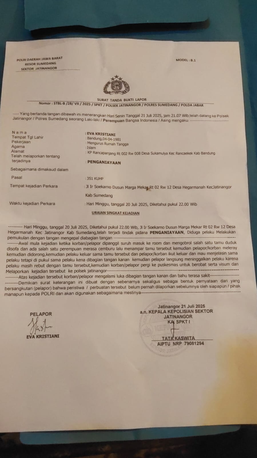 “Saya diminta keluar untuk menjelaskan bahwa saya tidak ada hubungan apa-apa dengan pria tersebut. Tapi tiba-tiba saya dipukul dan didorong hingga terjatuh. Saya kaget dan tidak sempat melawan,” ujar Eva saat diwawancarai usai membuat laporan.