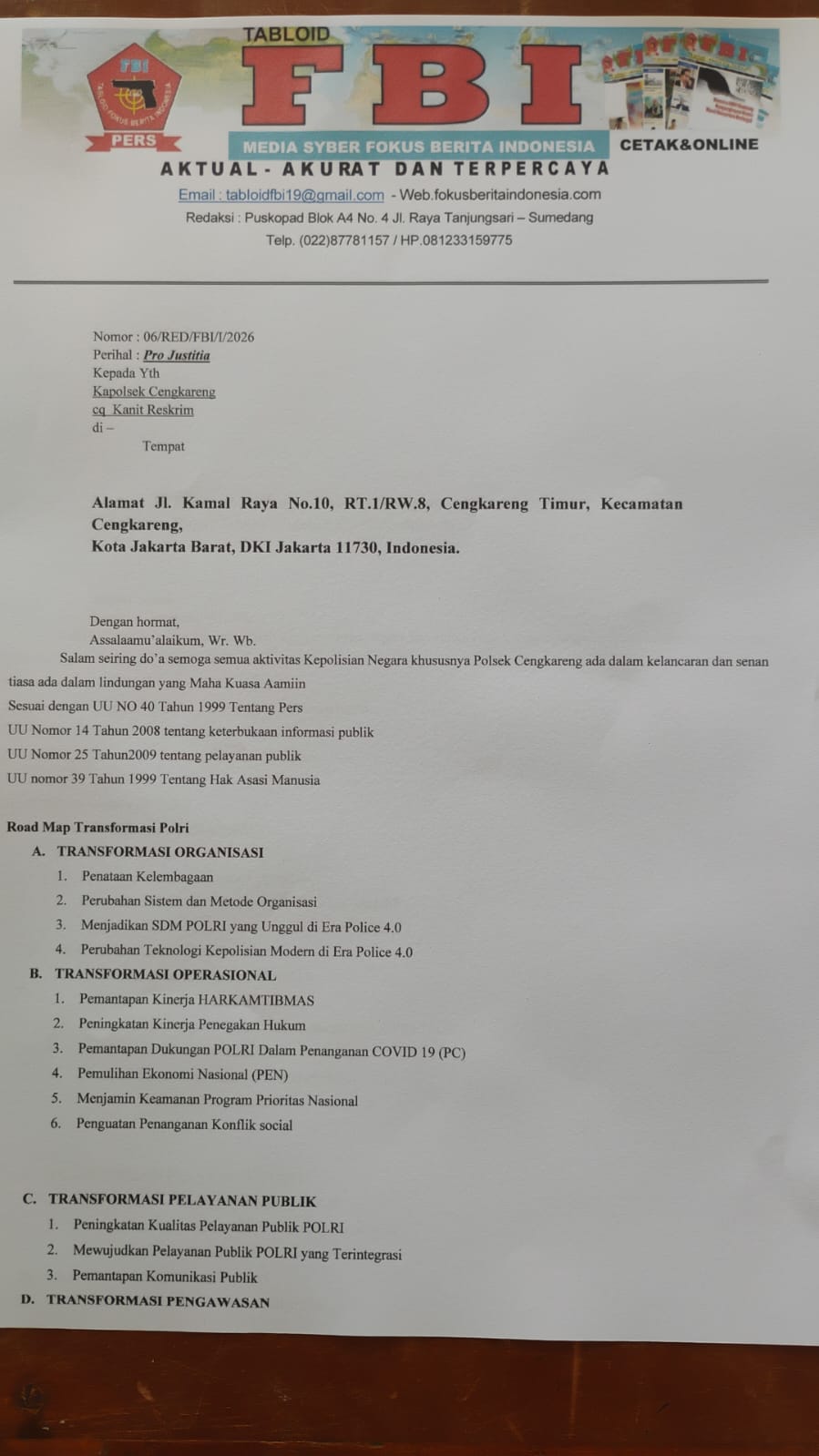 Melalui surat tersebut, Redaksi Fokus Berita Indonesia meminta agar penyidik Polsek Cengkareng dapat menindaklanjuti laporan secara profesional, transparan, dan sesuai prosedur hukum, serta memberikan kepastian hukum dan rasa keadilan bagi pelapor.
