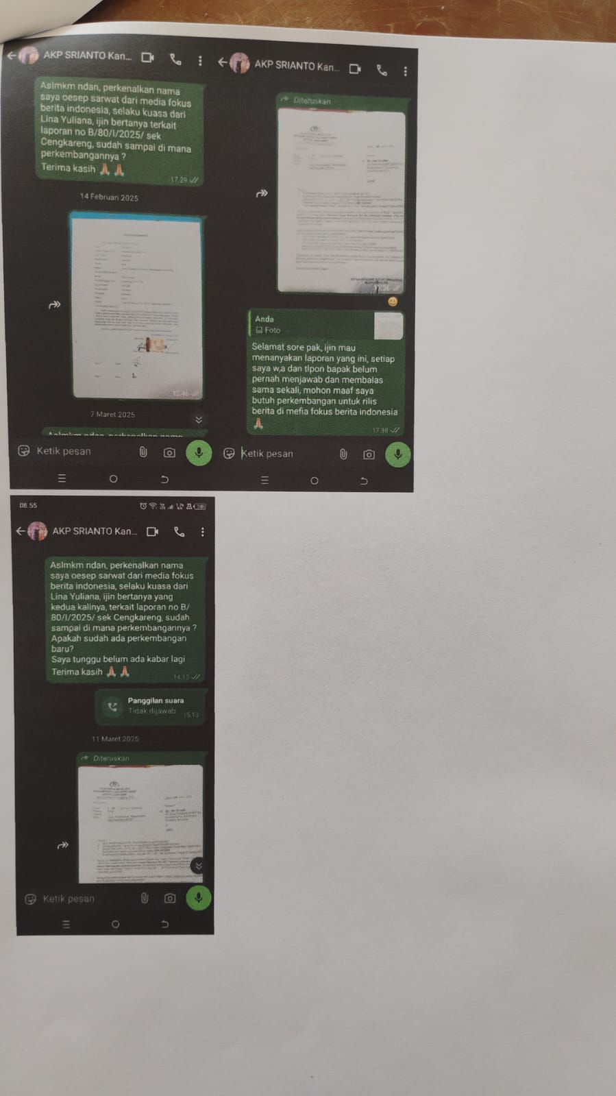 Crew Jurnalis Fokus Berita Indonesia selaku penerima kuasa dari Lina Yuliana menyampaikan bahwa pihaknya telah berulang kali meminta informasi perkembangan perkara kepada penyidik melalui pesan WhatsApp maupun sambungan telepon. Namun, upaya tersebut tidak pernah mendapatkan respons dari penyidik yang bersangkutan.