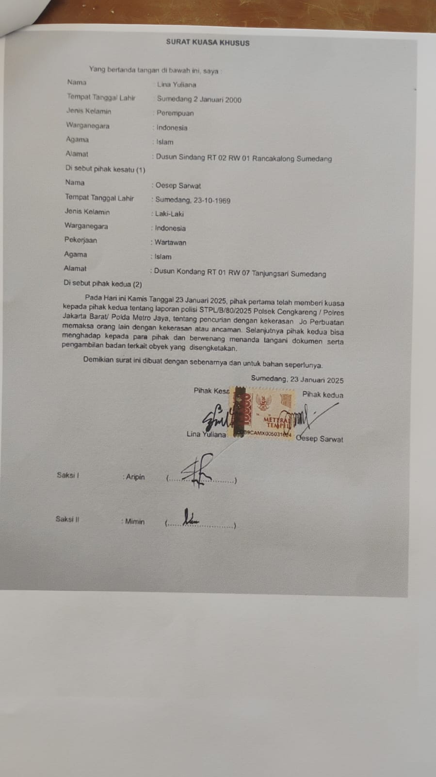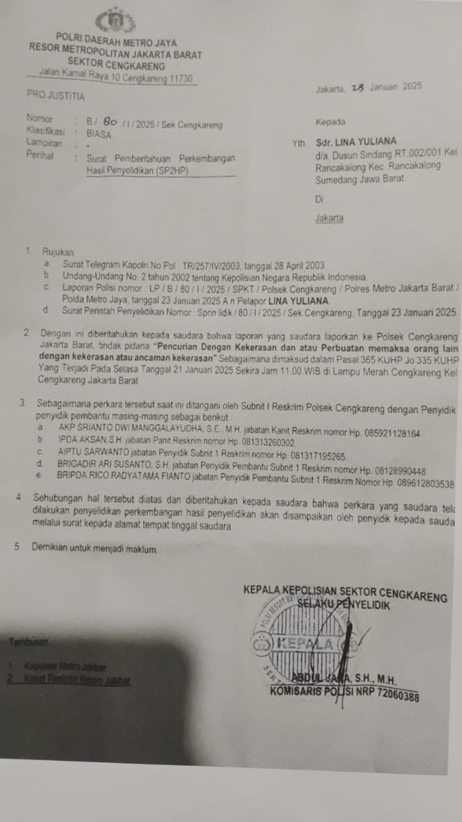 Perkara tersebut tercatat dengan Nomor B/20/I/2025/Sek Cengkareng serta Laporan Polisi Nomor B/80/I/2025/Sek Cengkareng, dengan terlapor berinisial Matel, terkait dugaan pelanggaran Pasal 365 jo Pasal 335 KUHP.