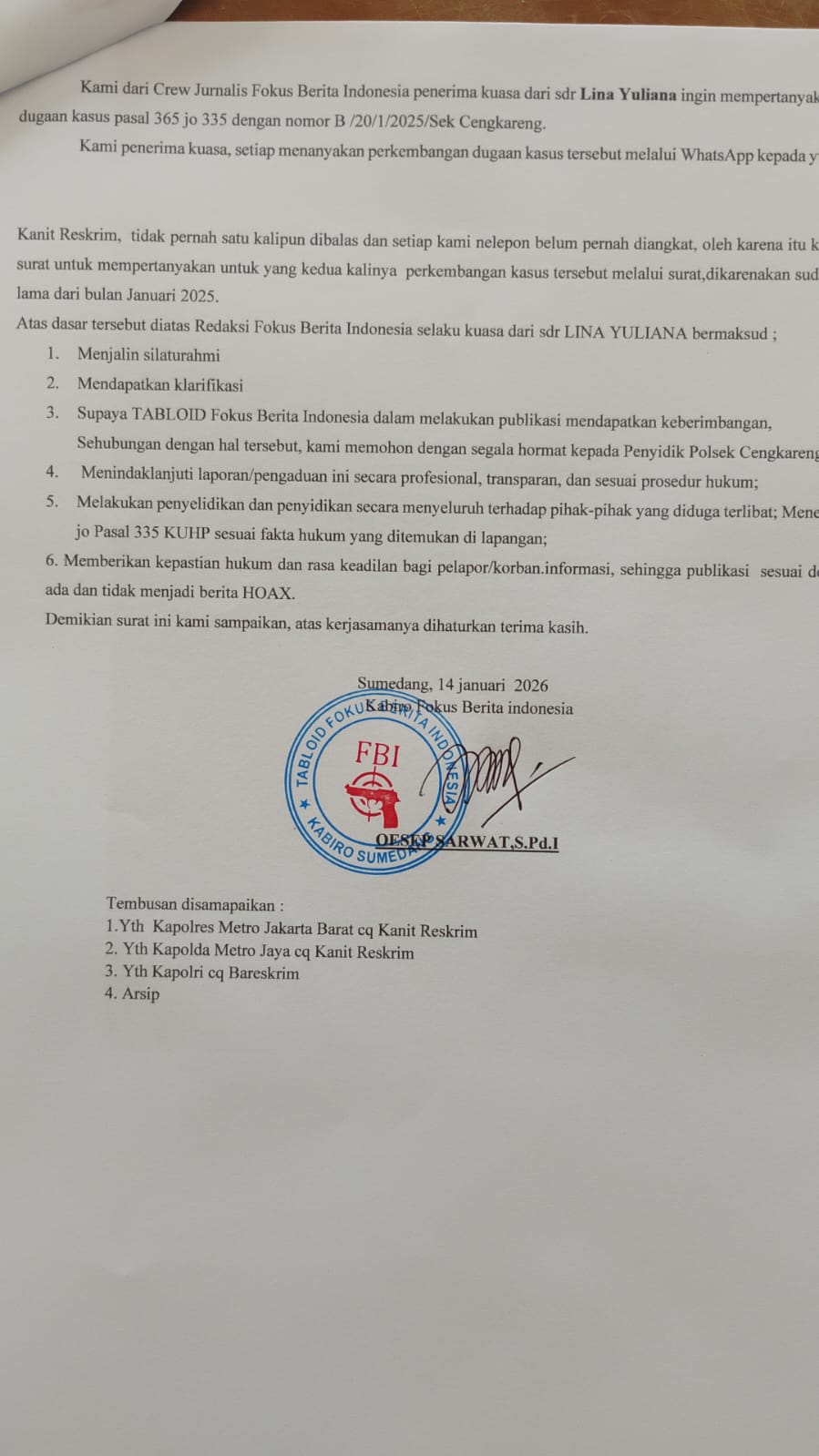 Jakarta FBI .www.tabloidfbi.com – Senin , 19/1/2026 Redaksi Fokus Berita Indonesia menyoroti lambannya penanganan dugaan tindak pidana Pasal 365 jo Pasal 335 KUHP yang dilaporkan ke Polsek Cengkareng. Hingga kini, laporan yang telah berjalan sejak Januari 2025 tersebut disebut belum menunjukkan perkembangan signifikan.