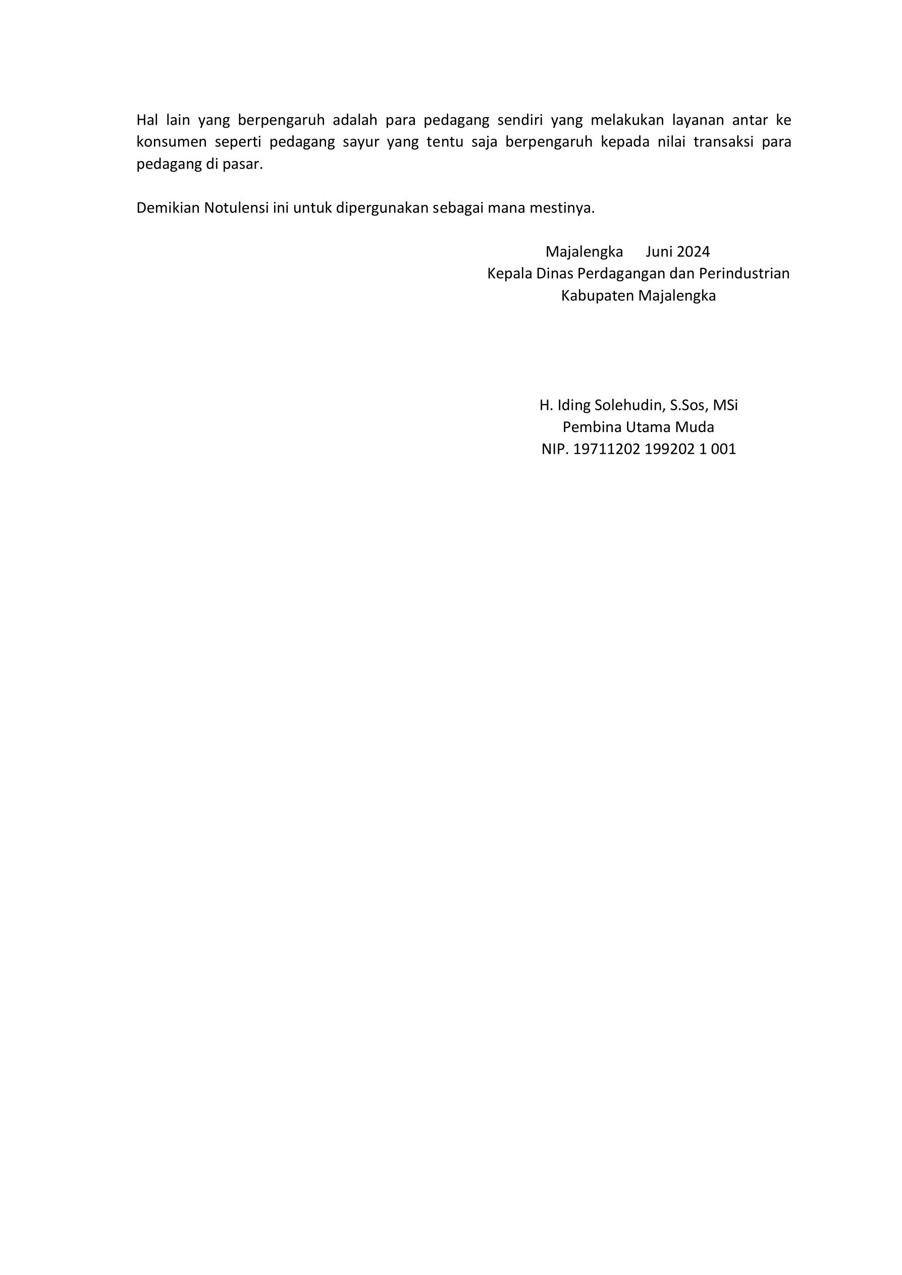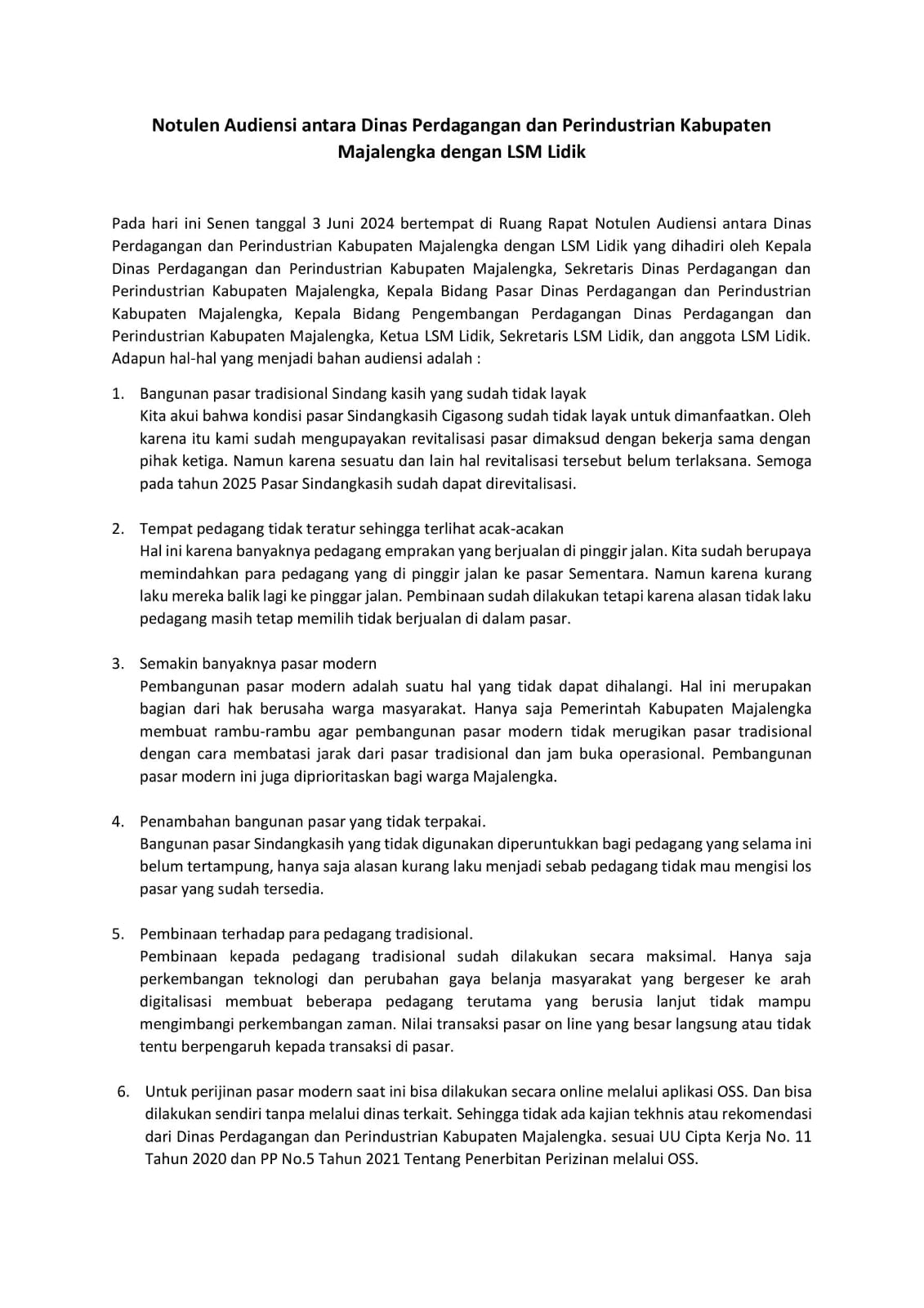 ” Saya mendapatkan Notulen hasil dari Audensi dari staf hanya soft copy,dan juga hasil dari audiensi tersebut dalam notulen tersebut belum ditandatangi oleh H. Iding Solehudin, S.Sos., M.P. selaku Kepala Dinas Indagin kabupaten Majalengka dengan keterkaitan pasar modern, itu baik dari retribusi ataupun perizinan, dan itupun berkaitan dengan dinas DPMPTSP, PUTR,dan DPKAD. Sedikitpun indagin tidak ada sangkut pautnya saat kadis indagin berikan steatmen waktu audensi.